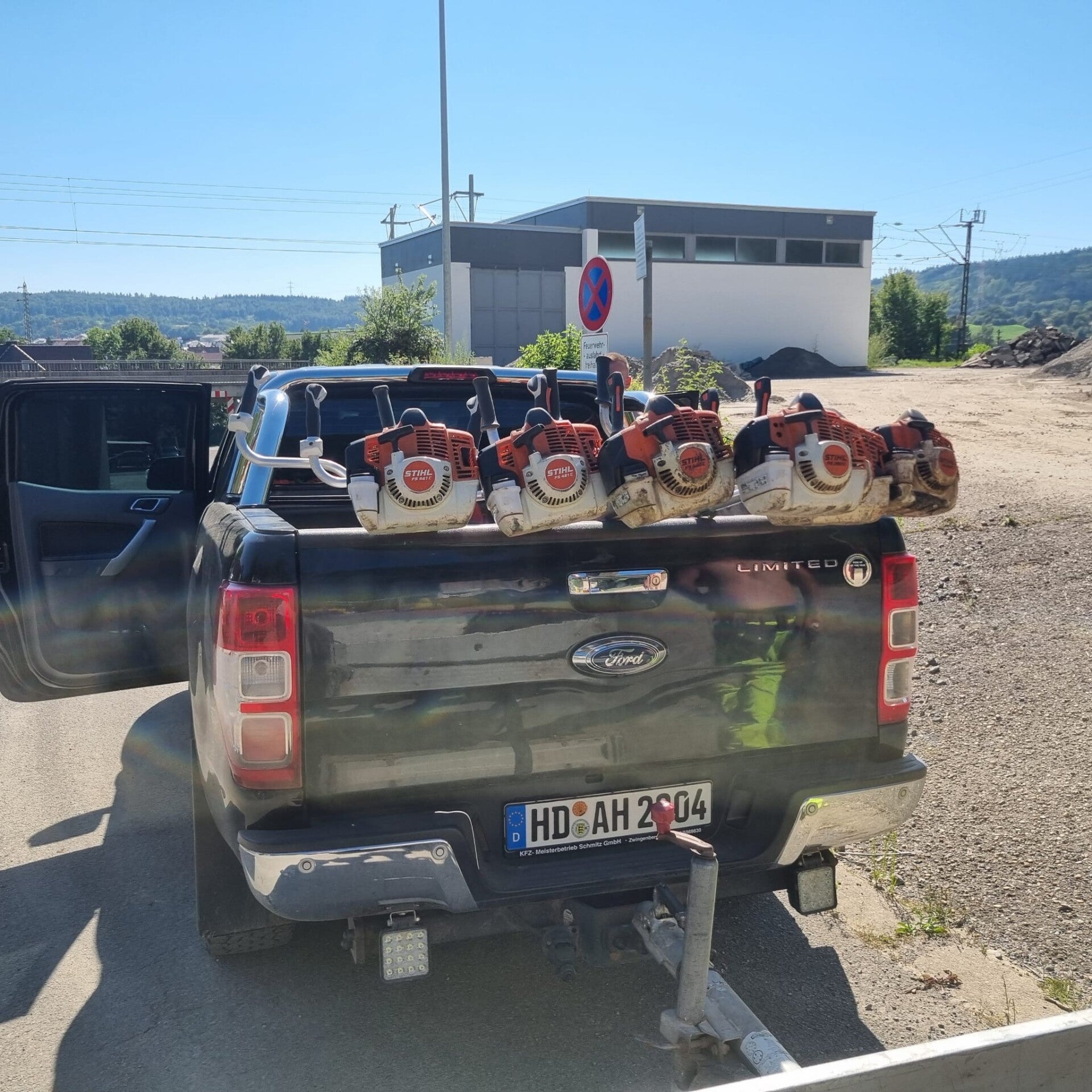 Wir können einsetzen Motorsägen, Heckenscheren und Hochentaster. Egal ob Steillage oder Flachland, wir können das alles und sind gut drauf.